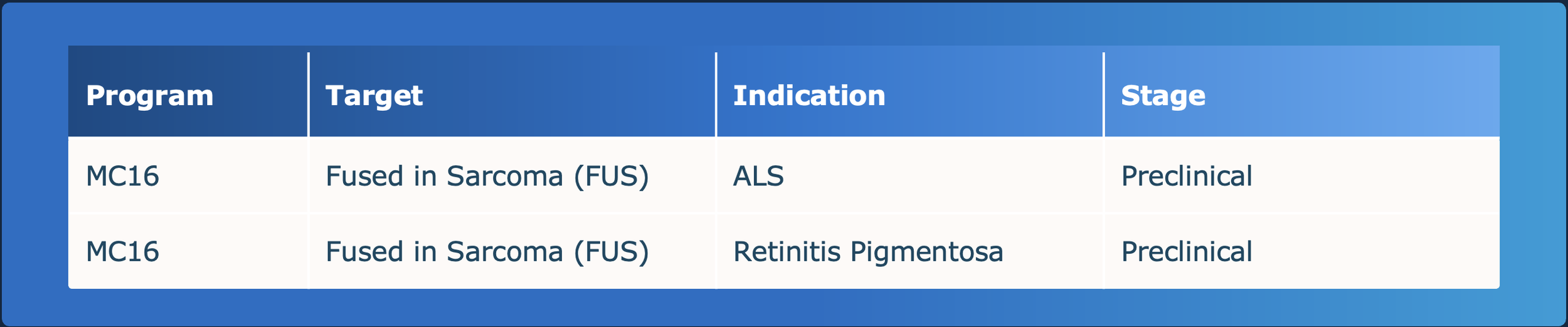 MitoChem’s development pipeline is focused on therapeutics that correct mitochondrial dysfunction across neurodegenerative indications.